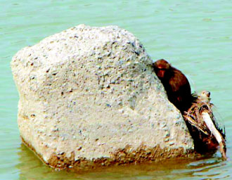 據臺灣聯(lián)合報報道,林務局工作站人員昨天上午經過高雄縣旗山鎮(zhèn)旗尾溪,發(fā)現(xiàn)有只臺灣小獼猴受困溪中,緊抱著溪中大石面對滾滾洪流動彈不得。