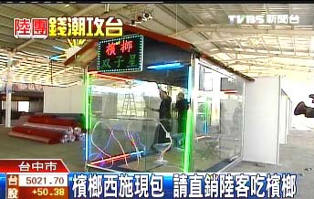 臺(tái)灣TVBS報(bào)道,在大陸安利公司游客即將到來的會(huì)場(chǎng)里,原本路邊隨處可見的檳榔攤被原封不動(dòng)搬進(jìn)會(huì)場(chǎng),18日當(dāng)天還會(huì)請(qǐng)來“正港”檳榔西施現(xiàn)場(chǎng)包檳榔給大陸游客品嘗品嘗,為的就是讓大陸人感受真實(shí)的臺(tái)灣生活。