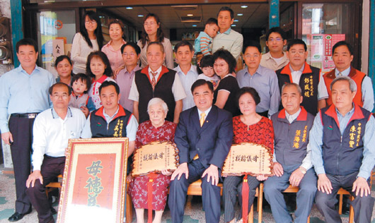 中壢市長(zhǎng)葉步梁前天拜訪模范母親鐘花妹,得知她的媽媽張詹丹妹也獲得興國(guó)里模范母親表?yè)P(yáng)。葉步梁及市代會(huì)主席吳嘉和等人,昨天前往元化路2段拜會(huì)張詹丹妹,女兒鐘花妹及四代同堂曾孫子、曾孫女也趕回來(lái)慶!半p喜臨門”,氣氛熱鬧。