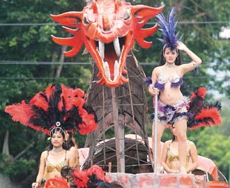 中新網(wǎng)11月5日電 據(jù)臺(tái)灣《聯(lián)合報(bào)》報(bào)道,臺(tái)北2007北投藝術(shù)嘉年華昨天熱鬧踩街,現(xiàn)場(chǎng)數(shù)十組花車(chē)隊(duì)伍爭(zhēng)奇斗艷,還有小丑踩高蹺,辣妹熱情的桑巴舞游行車(chē)隊(duì),也讓許多人駐足觀賞。