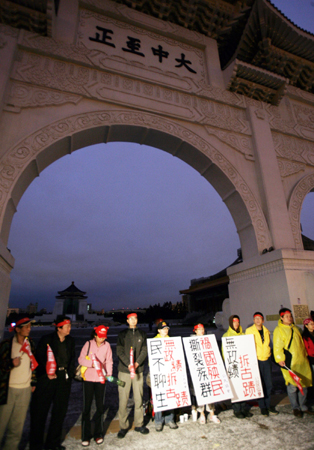 臺北中正紀念堂前的“大中至正”牌匾即將拆除,紅衫軍“自主公民協(xié)會”成員六日熬夜守護牌匾,抗議臺當局拆除古跡。有路過的綠營支持者罵三字經(jīng),引發(fā)沖突,隨即被警方帶走,避免紛爭!爸醒肷纭眻D 張皓安 攝