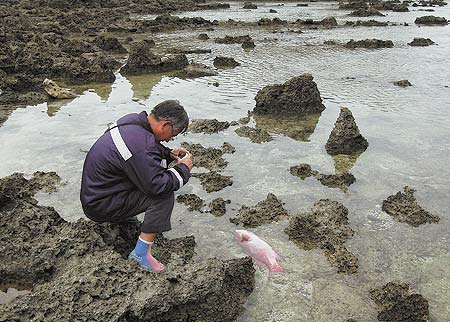 臺灣綠島暴斃的魚群原本只出現(xiàn)在燈塔到公館沿岸,六日連柚子湖一帶也出現(xiàn),到底是毒物擴(kuò)散還是單純地被沖刷到此,引來當(dāng)?shù)鼐用窀叨汝P(guān)切,拍照存證。臺灣《中國時報》圖