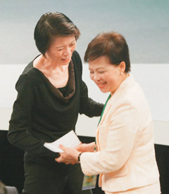 二00八年臺灣地區(qū)領(lǐng)導(dǎo)人選舉候選人第二場電視辯論會昨天舉行,馬、 謝辯論之前,馬英九夫人周美青(左),特地走向謝長廷夫人游芳枝(右)致意。臺灣《聯(lián)合報(bào)》圖 黃義書 攝
