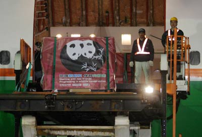贈臺大熊貓抵達臺北桃園機場,圖為工作人員展開裝載作業(yè) “中央社”圖