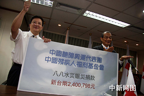 在簡(jiǎn)短的捐贈(zèng)儀式上,中國(guó)聽障奧運(yùn)代表團(tuán)團(tuán)長(zhǎng)賈勇表示,這次前來(lái)臺(tái)北參加第二十一屆聽障奧運(yùn)會(huì),借此機(jī)會(huì),他代表中國(guó)聽障奧運(yùn)代表團(tuán)和中國(guó)殘疾人福利基金會(huì),向“八八水災(zāi)”罹難的同胞們捐款。希望為受災(zāi)同胞加油,災(zāi)區(qū)重建工作盡快回復(fù)。同時(shí)希望擴(kuò)大包括運(yùn)動(dòng)員在內(nèi)的兩岸交流,增進(jìn)彼此了解,共同抗擊自然災(zāi)難。