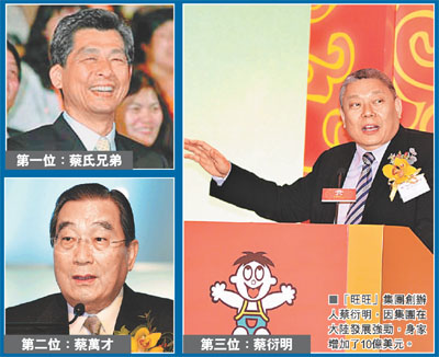 今年上榜富豪中僅5人錄得資產(chǎn)增長,當(dāng)中3人得益于大陸業(yè)務(wù)發(fā)展!按筅A家”是旺旺集團(tuán)創(chuàng)辦人蔡衍明,集團(tuán)在大陸發(fā)展強勁,身家急漲10億美元,排名從第9名跳升至第3名。另一食品集團(tuán)康師傅的創(chuàng)辦人魏應(yīng)州,身家也大增5.5億美元,升至第5名。