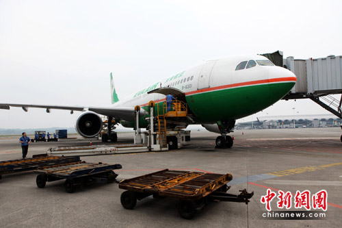 中新網(wǎng)重慶5月26日電 (記者 郭晉嘉)隨著富士康、英業(yè)達(dá)等臺(tái)企入駐重慶,今年以來(lái)渝臺(tái)直航航線客運(yùn)持續(xù)火爆,貨運(yùn)開始升溫。5月26日,臺(tái)灣立榮航空的B7192航班由麥道90機(jī)型改為252座的空客330機(jī)型執(zhí)飛,這是重慶—臺(tái)灣航線首次采用大型寬體機(jī),也是首次大批運(yùn)送貨物。