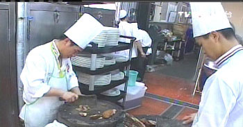 廚房里,43名大陸沙縣廚師忙里忙外,要籌備17道家鄉(xiāng)特色小吃,可不容易。豆腐、蛋白、再加點地瓜粉,充分攪拌后,加上一點鮮肉,放進熱水中,這是沙縣特色的豆腐丸子。