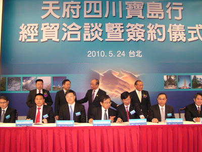 四川省工業(yè)經(jīng)濟(jì)聯(lián)合會(huì)與工業(yè)總會(huì)、臺(tái)灣區(qū)電機(jī)電子工業(yè)同業(yè)公會(huì)等川臺(tái)經(jīng)貿(mào)、旅游、農(nóng)業(yè)、文化團(tuán)體,上午共簽署5份合作協(xié)議!百Q(mào)協(xié)”下午在臺(tái)北國(guó)際會(huì)議中心舉辦川臺(tái)采購(gòu)洽談會(huì),預(yù)計(jì)安排上百場(chǎng)1對(duì)1洽談。