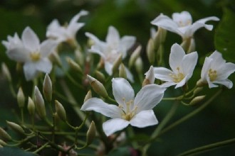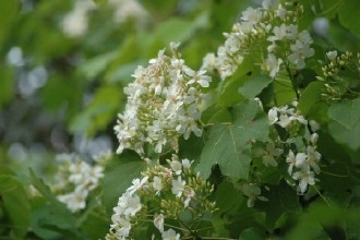 油桐樹開的花,被愛花人昵稱“桐花”,花開時(shí)白花成簇堆聚綠葉上頭,有如冬雪輕覆枝頭,加上花朵隨風(fēng)吹飄落,模樣更像是雪花,因而贏得“夏雪”美名,雖然四月便見桐花開,但因盛花期落在五月間,又有“五月雪”的封號(hào)。