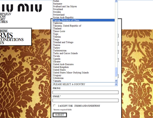 中新網(wǎng)6月5日電 據(jù)臺灣TVBS報道,知名咖啡連鎖店日前才因為網(wǎng)頁把臺灣列為中國一省遭到島內一些消費者發(fā)動拒買抗議,現(xiàn)在又傳出意大利高級皮件品牌MIUMIU,在官網(wǎng)訂閱電子報里的國家欄,將臺灣列為中國一省。對此,綠營又拿出來說事。