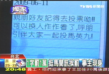一封提醒親朋好友去投票,還要大家一起投票給馬英九的短信,看的人可以完全不理會(huì),但是傳短信的黎煌雷卻違反選舉規(guī)定,在選舉當(dāng)天幫忙助選,遭臺(tái)“中選會(huì)”開罰50萬(wàn),等于1字要價(jià)1萬(wàn),黎煌雷不服氣要上訴。