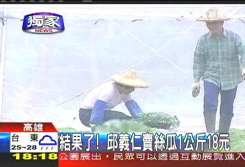 中新網(wǎng)7月20日電 據(jù)臺灣TVBS報道,臺當(dāng)局前“國安會秘書長”邱義仁5月初南下高雄務(wù)農(nóng),經(jīng)過2個多月,他種的絲瓜現(xiàn)在已經(jīng)結(jié)實累累,3天前邱義仁開始采收,10多箱的絲瓜經(jīng)由產(chǎn)銷班賣到臺北,1公斤的價格大概新臺幣18元,邱義仁的好友戴振耀說,受到臺風(fēng)影響,價格不算好,不過總算是邱義仁當(dāng)農(nóng)夫交出的第一張成績單。