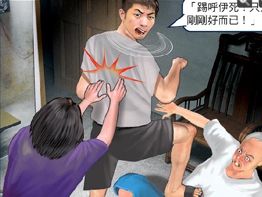 沈父倒在地上不斷哀號,在房內(nèi)睡覺的沈弘隆姑姑趕緊跑出來察看,大喊:“不要打了!”一把將侄子推開說:“當(dāng)兒子的,怎么可以打老爸!钡蚝肼∈ダ硇,還回嗆姑姑說:“踢呼伊死(指沈父)!只是剛剛好而已!”甚至拉開姑姑,再踢了父親一腳,才掉頭逃離現(xiàn)場。