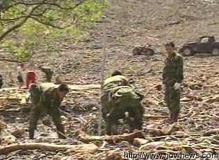 臺軍士兵頂著大太陽在一大片的土石堆中,用圓撬、徒手慢慢的尋找災民的遺體,搜救臺軍表示,“有血水的,顏色比較深的,接近黑色的水,還有蒼蠅,對不對?有蛆,對不對?有大石頭搬開一下聞一下它的味道!