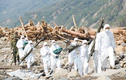 中新網(wǎng)8月20日電 臺(tái)軍部隊(duì)以及相關(guān)搜救人員連日來(lái)持續(xù)在高雄縣小林村等重災(zāi)區(qū)陸續(xù)搜索罹難者遺體,當(dāng)?shù)匕l(fā)現(xiàn)30幾處地面滲出血水,19日,搜救人員發(fā)現(xiàn)部分尸塊,推測(cè)是媽媽抱著小兒子逃命,卻不幸被傾流而下的巨大土石流掩滅。消息傳出,村人不勝唏噓。