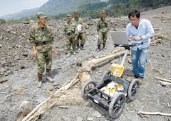 搜救人員表示,今天會(huì)再運(yùn)送兩臺(tái)儀器到小林村幫組搜尋,因?yàn)?zāi)難發(fā)生當(dāng)時(shí)很多人在屋內(nèi),故會(huì)先用儀器探測(cè)找出房舍再開(kāi)挖。他們介紹儀器說(shuō),“電磁波探測(cè)儀”用來(lái)找尋地面下的石油、探礦,探測(cè)深度達(dá)十米;“透地雷達(dá)”則是發(fā)射雷射波,探測(cè)地面下是否有物體存在。