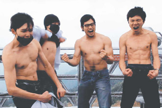 學(xué)生們在景觀臺上一字排開,女同學(xué)一聲令下,有3人先脫掉上衣,露出結(jié)實(shí)的肌肉,但第4人僅做象征性的配合,將胸前的衣服拉高,臉部還戴著口罩,遭到女同學(xué)大聲糾正。