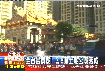 中新網(wǎng)1月19日電 據(jù)臺灣TVBS報道,臺北縣的深丘福德宮,因為蓋在黃金地段的新板特區(qū),以2年前一平米200萬(新臺幣 下同)的地價計算,這間土地公廟地價已經(jīng)高達2.8億,號稱是全臺最貴的廟。之前因為采購法遲遲無法完工,最近終于蓋好了,上午舉行安座大典,神明搬新家,場面相當(dāng)熱鬧。