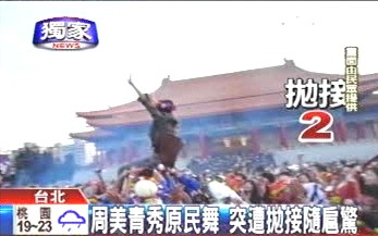 中新網(wǎng)3月2日電 據(jù)臺灣TVBS報道,馬英九夫人周美青1日欣賞音樂劇演出,一時興起,親自跳起少數(shù)民族舞蹈。周美青跳舞跳得忘情,還四度被舞者拋向天空,讓現(xiàn)場民眾見識周美青活潑的一面。