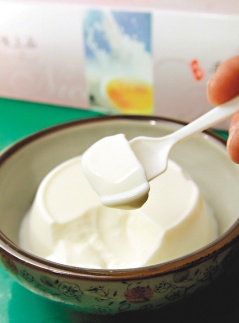 “吃起來(lái)很順口,有點(diǎn)彈性,入口涼涼的,不會(huì)很甜!绷纸ê甏蜷_自家奶酪,吃了一口發(fā)出贊美,又吃了口自家水蒸蛋糕,“綿綿密密,很細(xì)膩”,表情陶醉又自信。