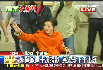 中新網(wǎng)6月15日電 據(jù)臺(tái)灣TVBS報(bào)道,陳水扁夫人吳淑珍15日下午再次到臺(tái)北地方法院開庭,針對(duì)前臺(tái)北101董事長(zhǎng)陳敏熏的千萬(wàn)捐款,法官傳喚前陳水扁辦公室主任馬永成,還有臺(tái)當(dāng)局前“財(cái)政部長(zhǎng)”林全到庭說明。