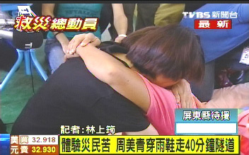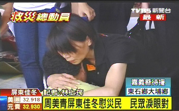 周美青努力安撫每位災(zāi)民,好幾位民眾一度都忍不住放聲哭泣,和周美青相擁在一起,周美青也緊緊的抱著他們,心情也跟著難過。