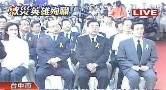 中新網(wǎng)8月19日電 據(jù)臺(tái)灣TVBS報(bào)道,臺(tái)風(fēng)“莫拉克”引發(fā)“八八水災(zāi)”重創(chuàng)臺(tái)灣南部,臺(tái)灣空勤隊(duì)3名英雄張順發(fā)、王宗立和黃鎂智為救人墜機(jī)殉職。臺(tái)中水湳機(jī)場(chǎng)19日舉行告別式,馬英九、“內(nèi)政部長(zhǎng)”廖了以、臺(tái)中市長(zhǎng)胡志強(qiáng)及呂秀蓮都到場(chǎng)致意。