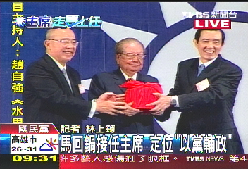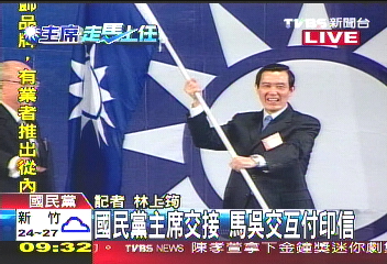 中新網(wǎng)10月17日電 馬英九17日上午接任中國國民黨主席,與吳伯雄進行交接儀式,接下黨主席印信,傳承黨旗。