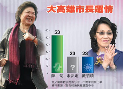 報(bào)道說,調(diào)查發(fā)現(xiàn),陳菊親民形象較黃昭順略勝一籌。55%選民對于陳菊有好印象,19%不喜歡她;相對來說,喜歡和不喜歡黃昭順的選民各占32%與19%,48%沒有深刻印象。從現(xiàn)階段支持率來看,陳菊目前獲得53%選民支持,黃昭順支持率23%,僅23%未決定。進(jìn)一步分析顯示,陳菊不僅在泛綠及中立選民獲得壓倒性支持,即便是泛藍(lán)支持者,也有25%屬意陳菊擔(dān)任大高雄市長。