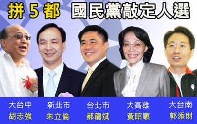 昨天,國民黨中央提名審核委員會決定“五都”征召人選,國民黨秘書長金溥聰宣布臺北市、新北市、大臺中、大臺南、大高雄分別征召臺北市長郝龍斌、“行政院副院長”朱立倫、臺中市長胡志強(qiáng)、前“立委”郭添財(cái)、“立委”黃昭順代表國民黨參選。