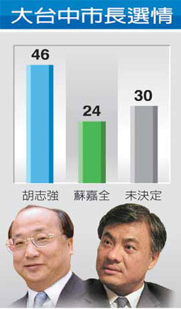 中新網(wǎng)6月4日電 據(jù)臺灣《聯(lián)合報》報道,臺中市接連發(fā)生重大治安和警紀案件,《聯(lián)合報》對大臺中市長最新選情調(diào)查發(fā)現(xiàn),胡志強目前雖以46%支持率領(lǐng)先蘇嘉全22%。