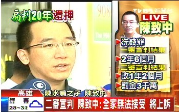 二審宣判出爐,陳致中從一審的2年6個(gè)月,罰金1.5億(新臺幣,下同),改判為1年2個(gè)月,并科罰金3000萬,不過他卻相當(dāng)不領(lǐng)情。