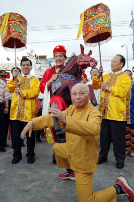 中新網(wǎng)10月29日電 國民黨參選人馬英九今天走訪臺(tái)灣歌仔戲發(fā)源地宜蘭縣員山鄉(xiāng)時(shí),除了詳細(xì)聽取當(dāng)?shù)厝耸拷庹f典故之外,還穿上戲服表演了一段“狀元游街”。