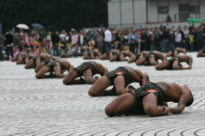 在高空跳傘表演之后,臺軍陸戰(zhàn)隊(duì)兩棲偵搜大隊(duì)赤裸上身表演蛙人操。隨后“陸軍步兵學(xué)校”體干班表演刺槍術(shù),演出團(tuán)體刺、沖鋒對刺、刺槍擊破等項(xiàng)目。不過,當(dāng)天使用的是練習(xí)用木槍,并非配上刺刀的真槍。
