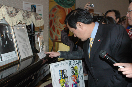 在下午忙碌的活動中,馬英九也抽空前往位于日比谷公園內(nèi)的松元樓,參觀與當年孫中山先生流亡日本時有關(guān)的史跡。松元樓現(xiàn)任社長夫人的祖父梅屋莊吉早年曾對流亡中的孫中山提供很多的協(xié)助,孫中山是一九一五年在梅屋的家與宋慶齡舉行婚禮的。松元樓的負責人親自為馬英九說明過去的這段歷史。