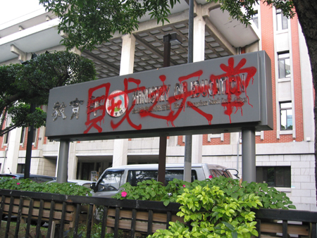 中新網(wǎng)12月5日電 因要拆除臺北中正紀念堂前“大中至正”這塊招牌,臺灣當(dāng)局“教育部”惹來群眾到現(xiàn)場抗議,結(jié)果連自家牌匾也遭殃,在四日下午被一名男子噴漆辱罵。