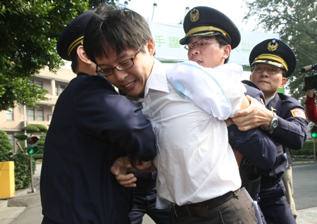 中新網(wǎng)12月11日電 臺灣第三社會黨發(fā)言人林致真、楊偉中今天上午前往臺當(dāng)局“行政院”門口,剪斷掛在圍墻的“牽手護臺灣,加入聯(lián)合國”布條,與警方發(fā)生沖突。