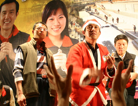 中新網(wǎng)12月24日電 隨著圣誕節(jié)的到來,臺灣的政治人物也搭上這股節(jié)日熱。國民黨“立委”參選人23日晚在高雄縣鳳山市舉辦圣誕晚會,馬英九裝扮成圣誕老人,發(fā)送糖果,分送幸福。