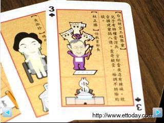 而“黑桃三”的杜正勝,不僅頭上頂著“三只小豬”,拿著“正名”、“成語(yǔ)”、“胡謅”三個(gè)牌子,腳下寫著“罄竹難書”和“音容苑在”兩句成語(yǔ),旁邊再批:“兒子有特權(quán)當(dāng)涼兵,官邸當(dāng)夜店有辣妹!蕦m’擴(kuò)建案搞八億。歪哥疑云,檢調(diào)不排除約談。”