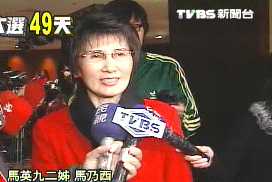 中新網(wǎng)2月2日電 據(jù)臺(tái)灣東森新聞報(bào)道,距離臺(tái)灣“大選”只剩下49天,馬英九的二姊馬乃西,已經(jīng)低調(diào)投入輔選的行列,老藝人尾牙(年終宴會(huì))和書法界馬蕭后援會(huì)的成立大會(huì)上,馬乃西都親自出席,但不同于大姊馬以南,馬乃西非常低調(diào),有關(guān)馬英九的問題統(tǒng)統(tǒng)不回答。