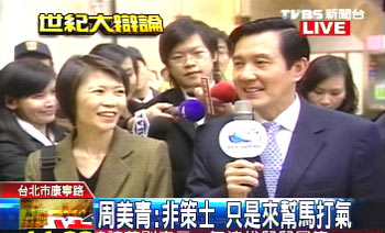 此次辯論會,周美青一樣參與了討論,也一樣非常地嚴格。她建議馬英九,多說一些小老百姓日常生活關(guān)心的話題,講述過程要簡單,賣弄文字得避免,最重要的是不可長篇大論。當記者詢問選戰(zhàn)是否應(yīng)偏向政策討論勝于口水戰(zhàn),她回答馬一直都沒打口水戰(zhàn)。