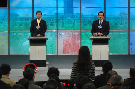 組圖:謝長(zhǎng)廷與馬英九首場(chǎng)電視辯論 握手致意