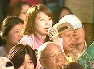 據(jù)臺(tái)灣東森新聞報(bào)道,雖然馬英九陣營(yíng)已自行宣布當(dāng)選,不過(guò)臺(tái)北市的長(zhǎng)昌總部仍有大批支持者留守,高舉旗幟、呼喊口號(hào)?吹街x長(zhǎng)廷慘敗,支持者在臺(tái)下忍不住拭淚,但仍努力打起精神,跟著民代大呼口號(hào),持續(xù)為民進(jìn)黨打氣加油。
