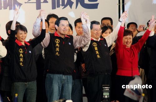 馬英九夫婦和蕭萬(wàn)長(zhǎng)夫婦在競(jìng)選總部前的集會(huì)上,與支持者共同慶祝勝選。中新社發(fā) 黃少華 攝
