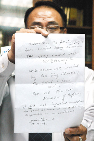 中新網(wǎng)5月8日電 臺當(dāng)局“金援丑聞案”中間人吳思材的律師徐景星,7日公開吳思材在收押前留下的“保命信”,對先前的說法大翻供,律師稱吳思材手寫的“洗錢分配流程”,兩千九百八十萬美元是匯回臺灣給官員。
