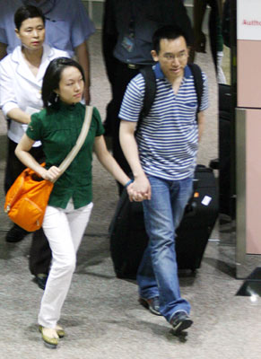 陳致中夫婦25日清晨5時(shí)左右搭機(jī)返臺(tái),兩人手牽手步出海關(guān)!爸醒肷纭眻D