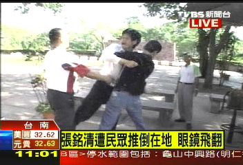 環(huán)球時(shí)報(bào)駐臺(tái)北特約撰稿人周先報(bào)道:據(jù)臺(tái)灣中天電視臺(tái)21日?qǐng)?bào)道,抵臺(tái)進(jìn)行學(xué)術(shù)交流的大陸海協(xié)會(huì)副會(huì)長(zhǎng)張銘清21日上午在臺(tái)南市安平古堡參觀時(shí),被綠營(yíng)支持者推倒在地,當(dāng)張銘清準(zhǔn)備乘車離開時(shí),有“臺(tái)獨(dú)”分子甚至跳上張的座車車頂狂踩,試圖阻止張銘清離開。另據(jù)臺(tái)灣TVBS電視臺(tái)消息,張銘清后腦勺被打,連眼鏡都被推飛了出去。