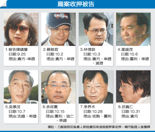 目前陳水扁弊案中,最早被收押的是卷入陳水扁家庭洗錢疑案的力麒建設(shè)公司負(fù)責(zé)人郭銓慶,他在9月12日,就因被臺(tái)北地檢署查出另涉世貿(mào)南港展覽館興建工程行賄標(biāo)案評(píng)選委員弊案,檢察官傳喚他到案,向臺(tái)北地方法院聲請(qǐng)羈押禁見獲準(zhǔn)。