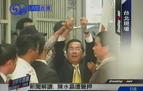 11月11日,臺(tái)檢方偵辦機(jī)要費(fèi)案及陳水扁家庭疑洗錢案,今天上午第五度以被告身份傳喚陳水扁到案說(shuō)明。經(jīng)過(guò)6個(gè)多小時(shí)的偵訊后,陳水扁被檢方聲請(qǐng)羈押禁見,并銬上手銬,移送到臺(tái)北地方法院開羈押庭,等待法官裁決是否要收押。圖片來(lái)源:電視截圖
